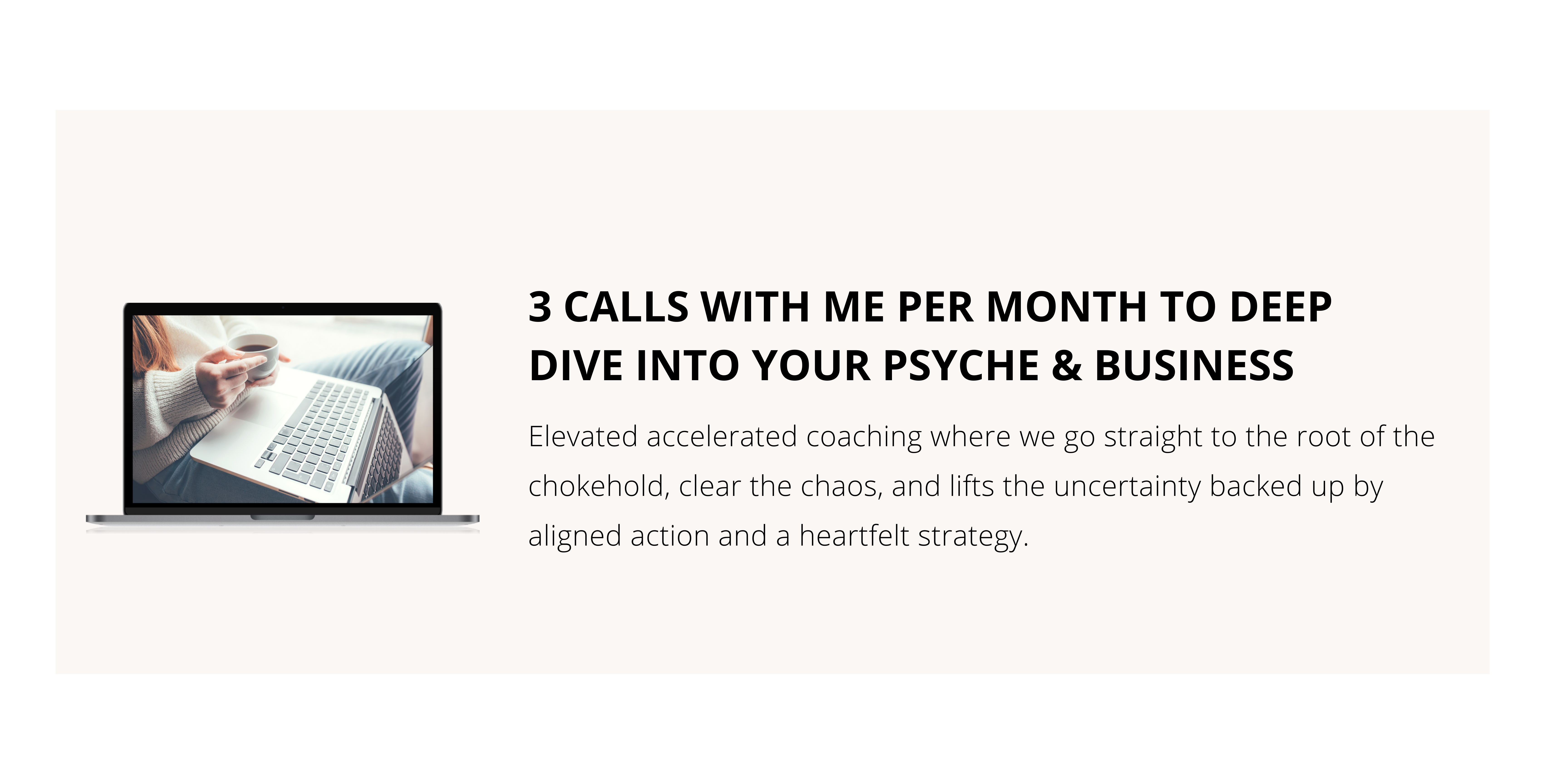At this intimate level, I support you in extracting your wisdom from your inherent whole and confident Self-energy so you can build your business the way it feels good for your energy constitution. How big you want to play is entirely up to you. I support you in your desires no matter what, but I am not here to tell you what is right or wrong for your business. All your big decisions come from a full-body yes, or we won’t implement it.